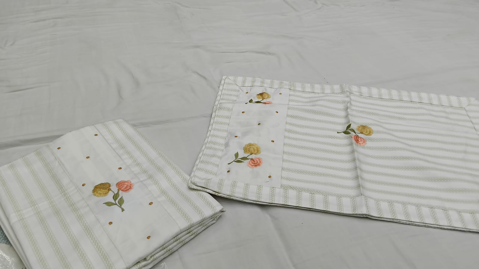Design & Aesthetics: The sets feature a clean, white or off-white base with delicate floral embroidery (notably rose motifs) centered on the spread and the pillowcases.