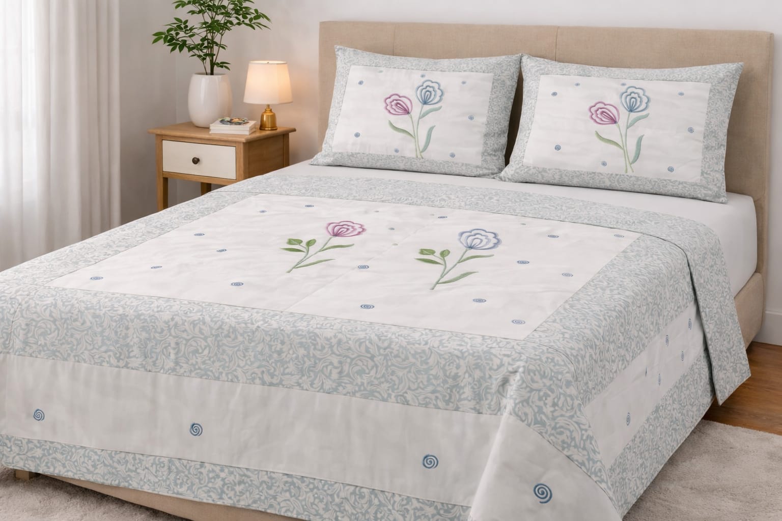 Fabric & Texture: The material looks to be a high-quality cotton or cotton-blend with a subtle quilted or textured finish on the borders, suggesting it can be used as both a decorative bedspread and a functional summer quilt.